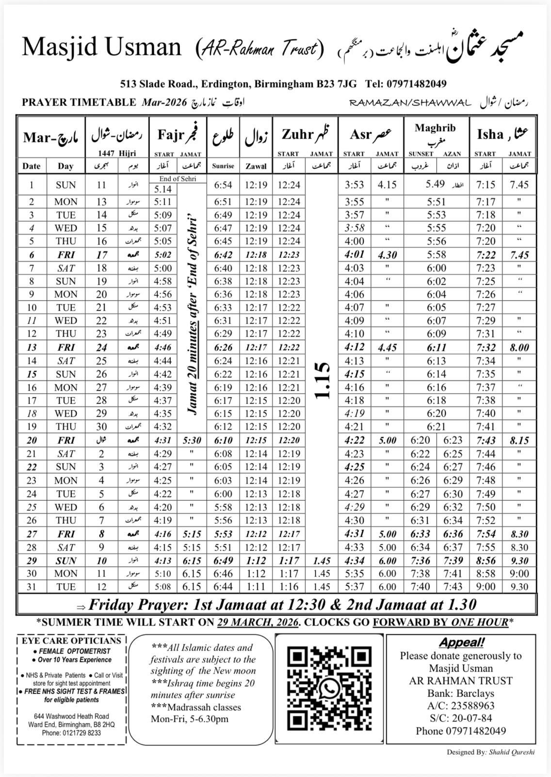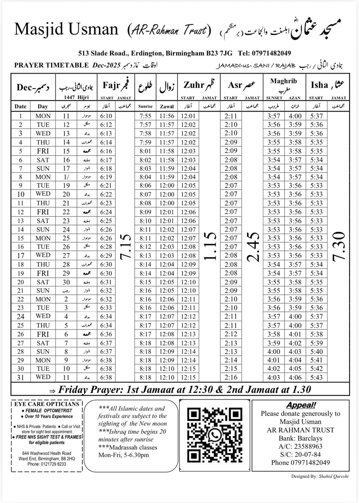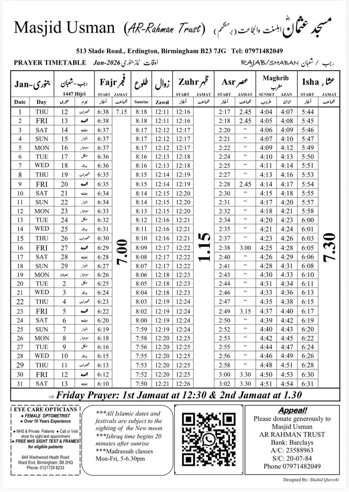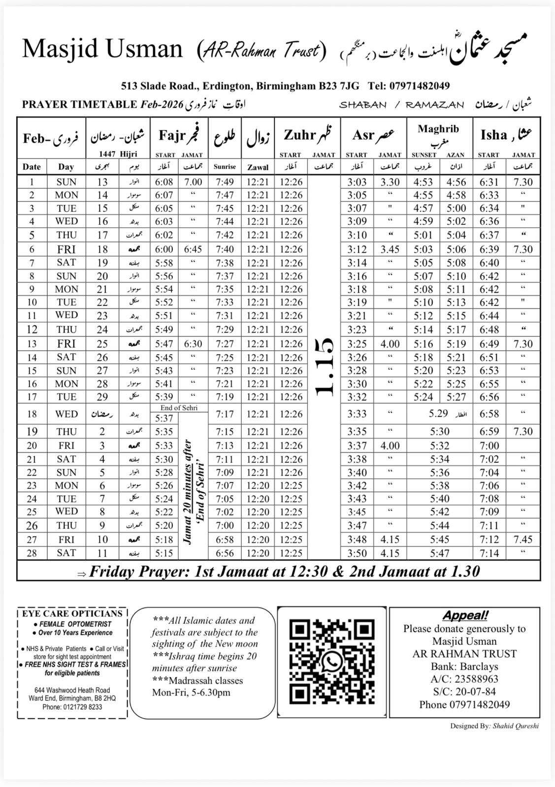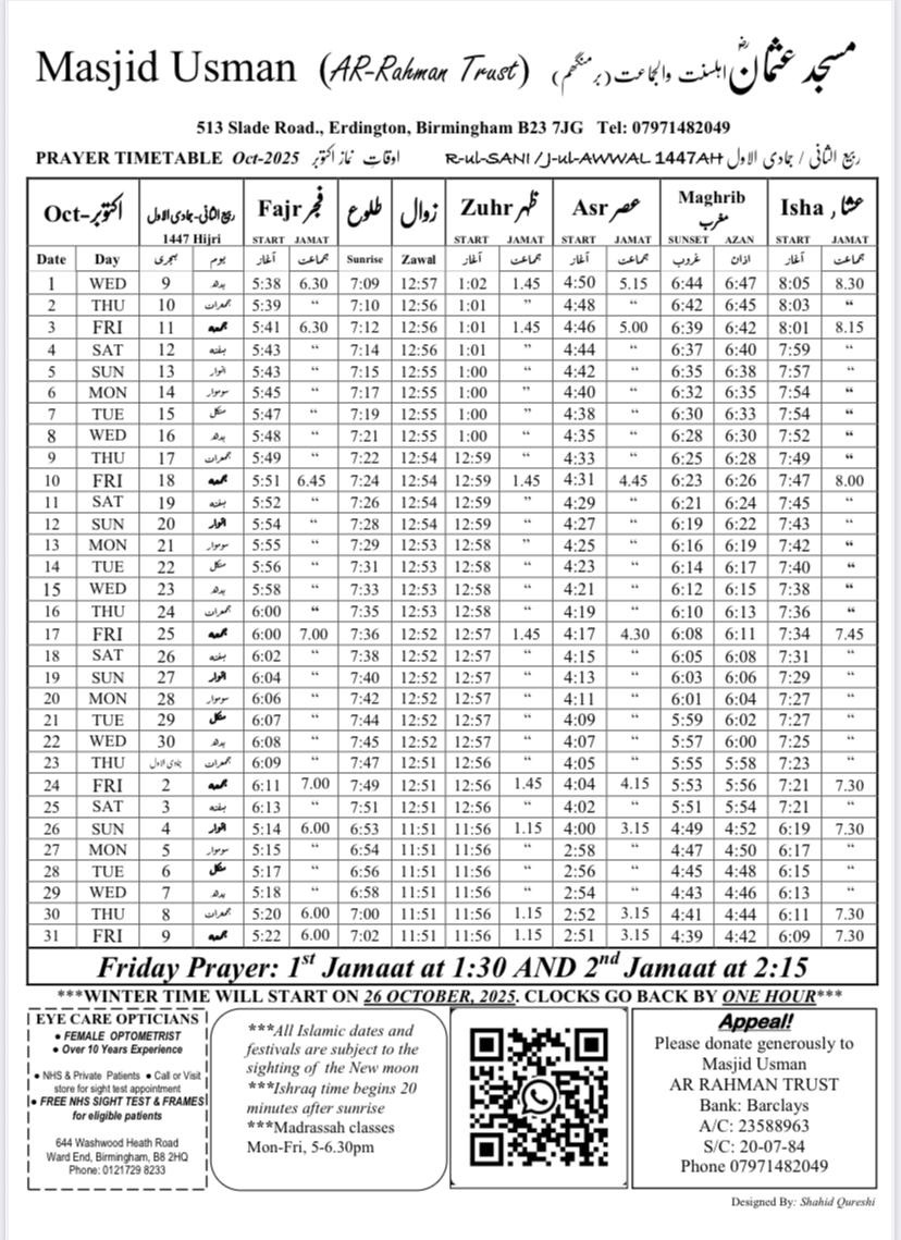There is a madrasa available Monday to Friday, 5-6:30pm for 4 to 17 year olds. The students are taught the Quran and tarbiya.
